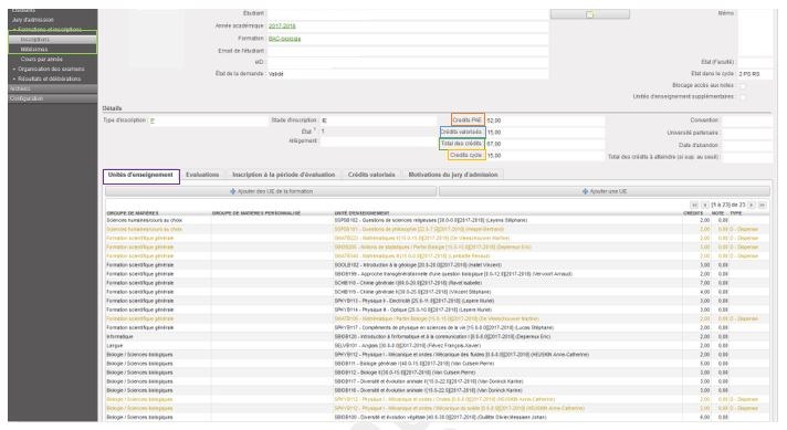 L’onglet « unités d’enseignement » reprend à la fois les UE inscrites au PAE de l’étudiant et celles pour lesquelles le jury lui a accordé une dispense. Pour mettre en valeur les UE constituant le PAE, les UE ayant fait l’objet d’une dispense apparaissent désormais en couleur.